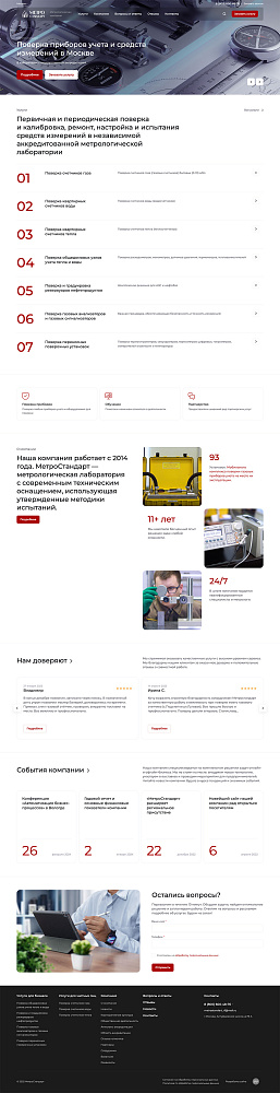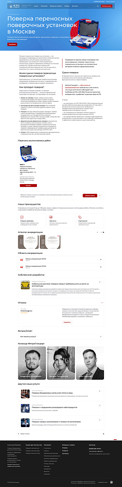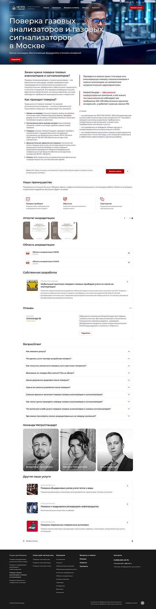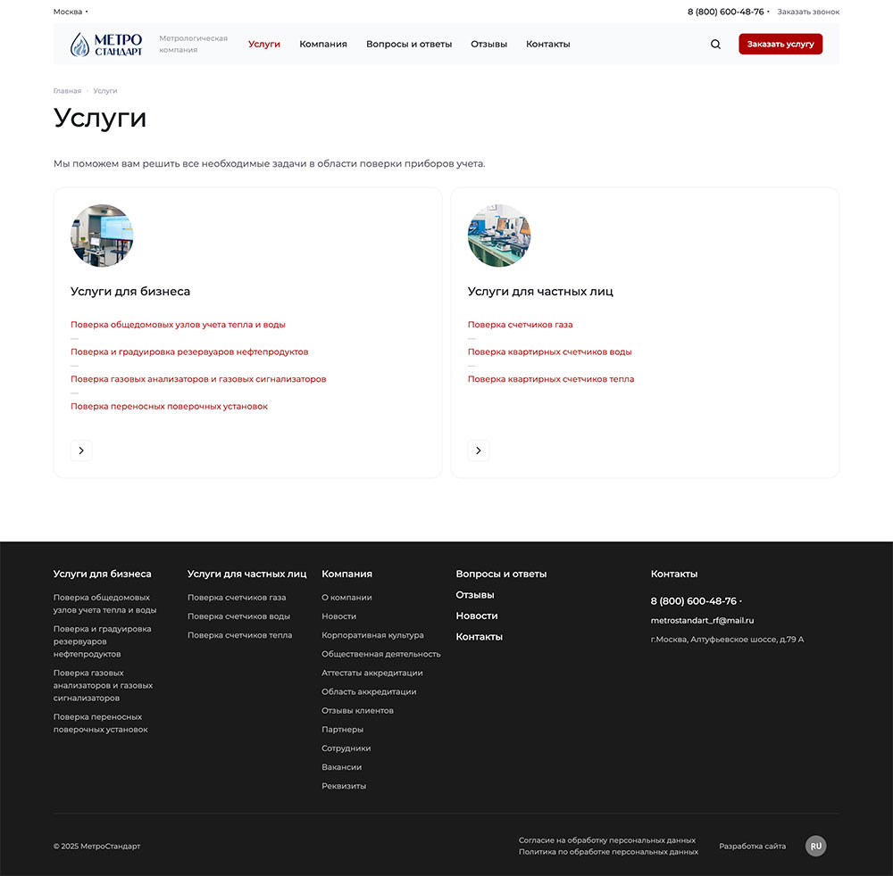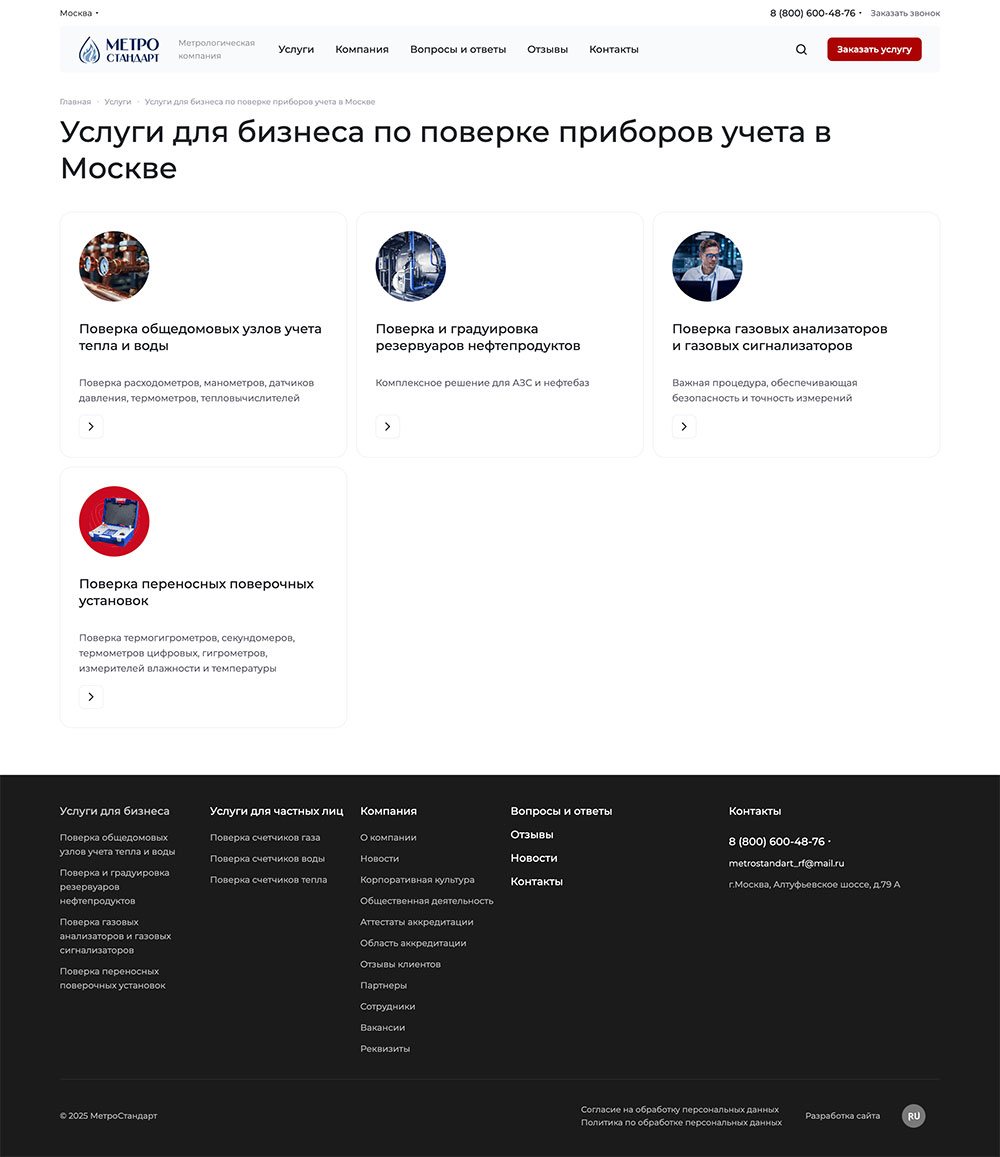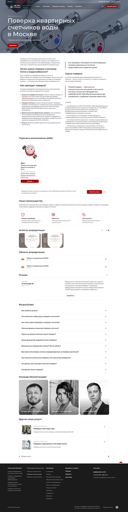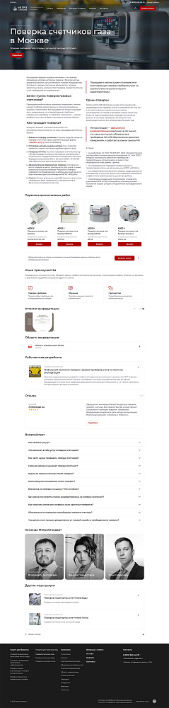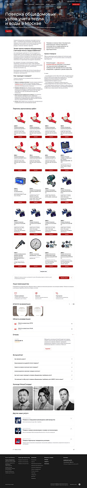 Для каждой услуги (напр., «Поверка общедомовых узлов учета тепла» или «Поверка счетчиков воды для квартиры») была создана страница, содержащая блоки: