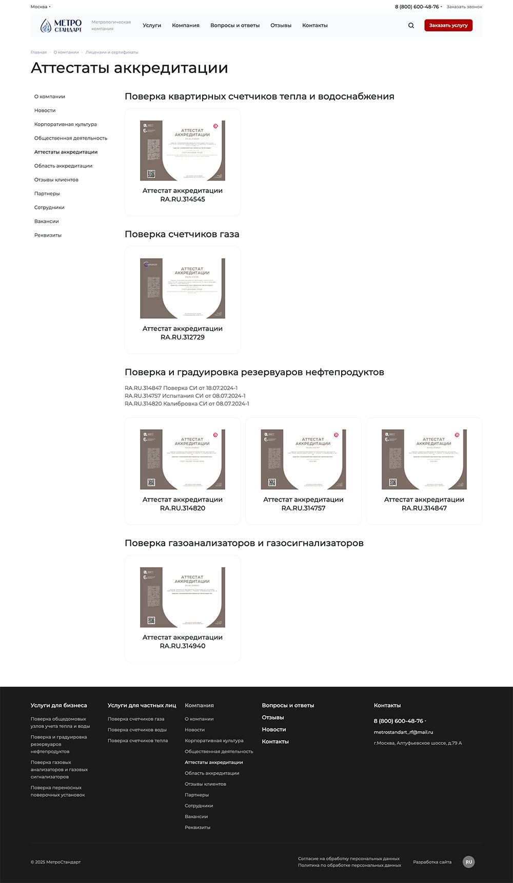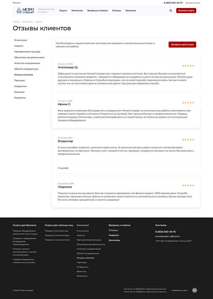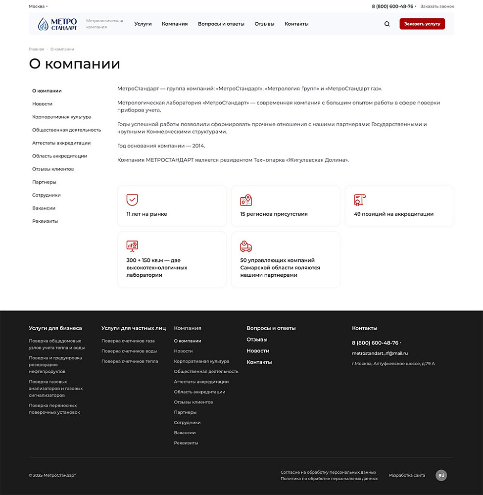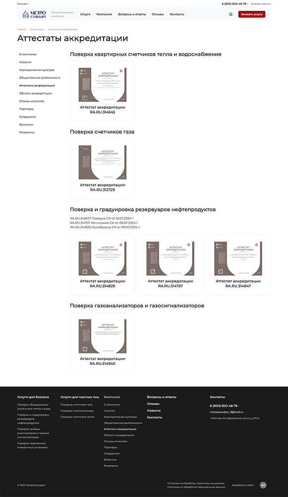 По данным опроса новых клиентов, 85% отметили, что наличие на сайте подробной информации об этапах, аттестатах и команде стало ключевым фактором при выборе «Метростандарт».